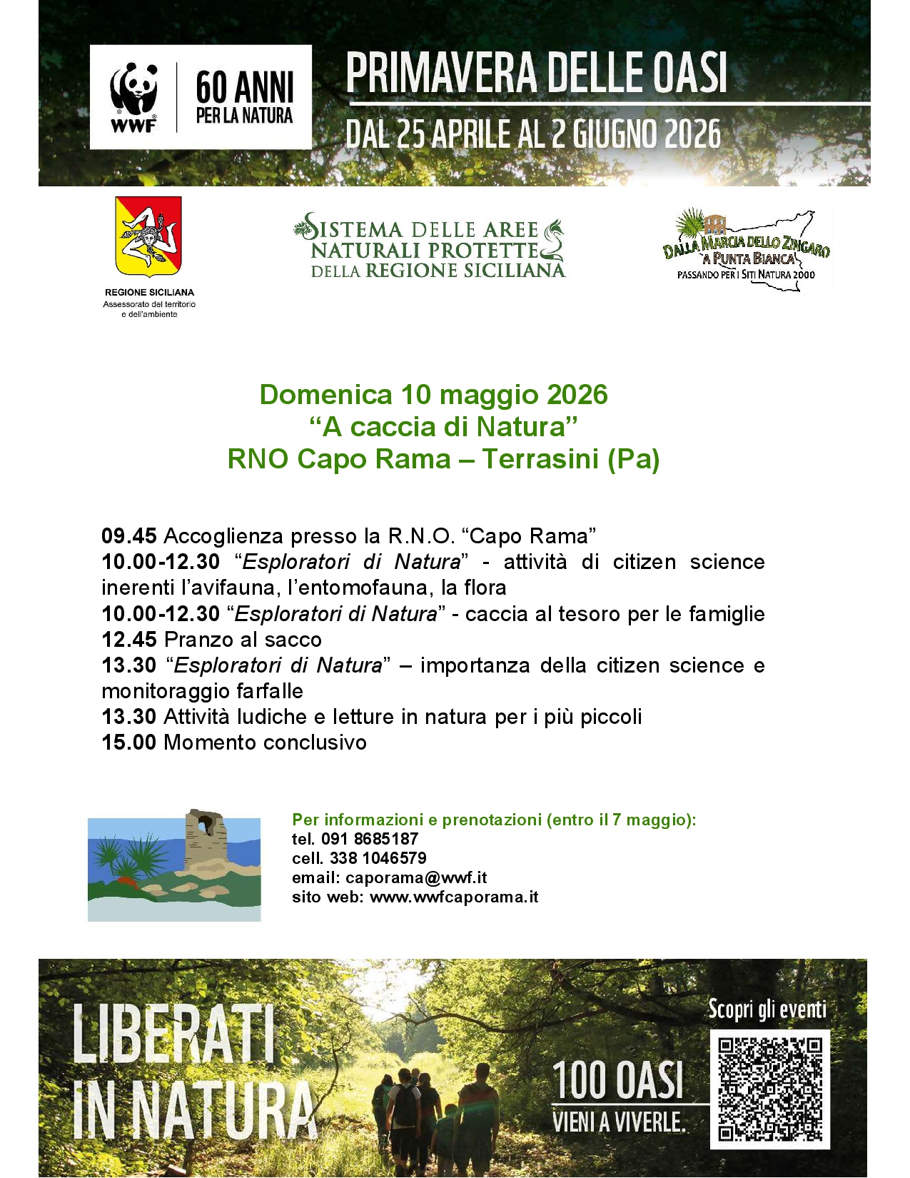 Il WWF Italia, ente gestore della Riserva Naturale Capo Rama, organizza nell'ambito dell'evento "La primavera delle Oasi dal 25 maggio al 2 giugno 2026" e delle  attività promozionali del Sistema delle Aree Naturali Protette della Regione Siciliana "Dallo Zingaro a Punta Bianca (passando dai Siti Natura 2000)"(orbs.regione.sicilia.it/images/PROGRAMMA_EVENTI_2026_Sistema_Aree_Naturali_Protette_Siciliane_def_20_02_2026.pdfun’attività per esplorare la Natura attraverso citizen science sulla fauna e sulla flora e, per i più piccoli, una caccia al tesoro.